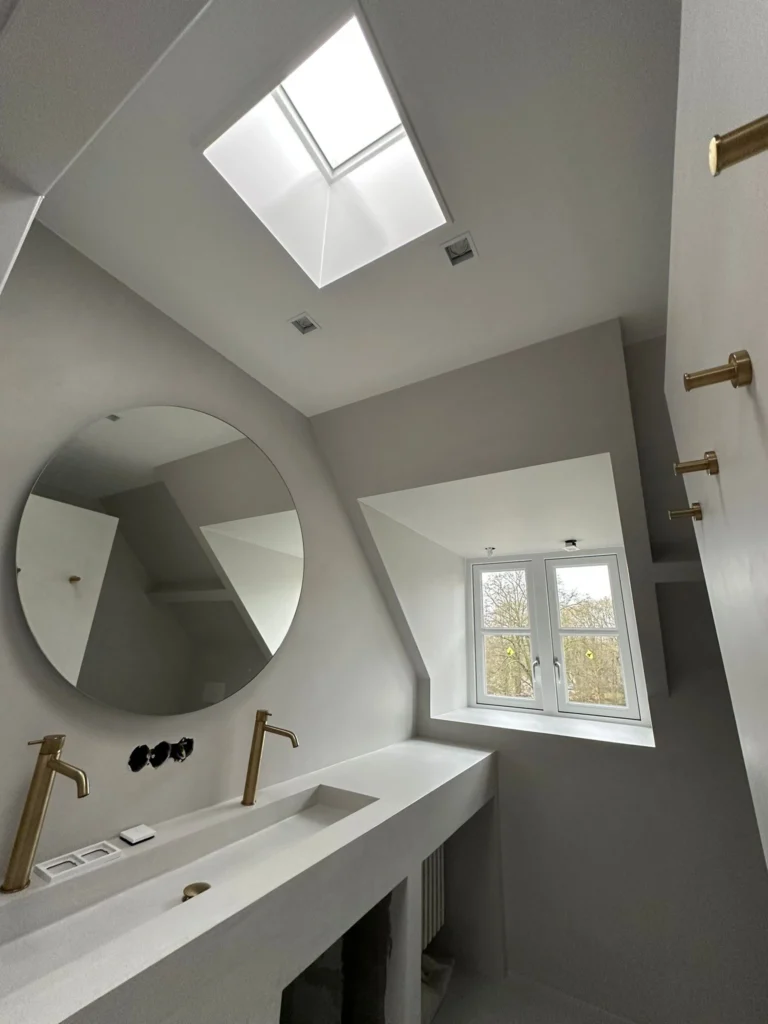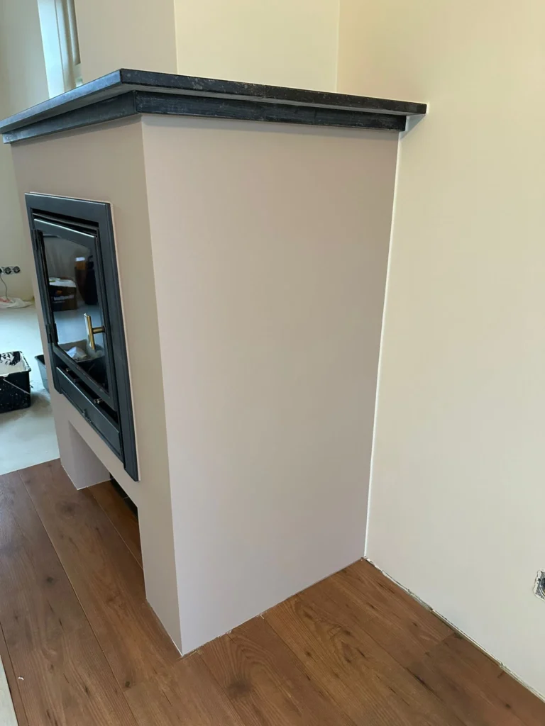 Afwerking binnen: wanden/plafonds (mat of schrobvast), houtwerk in zijde- of hoogglans met strakke kitnaden.