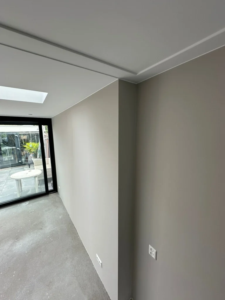 Het effect: wanden en plafonds die rustig ogen, zonder banen of aanzetten, ideaal voor moderne interieurs in bijvoorbeeld Nijmegen-Oost en Nijmegen-Noord.